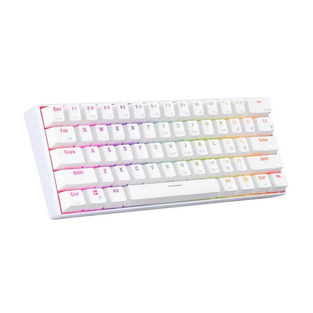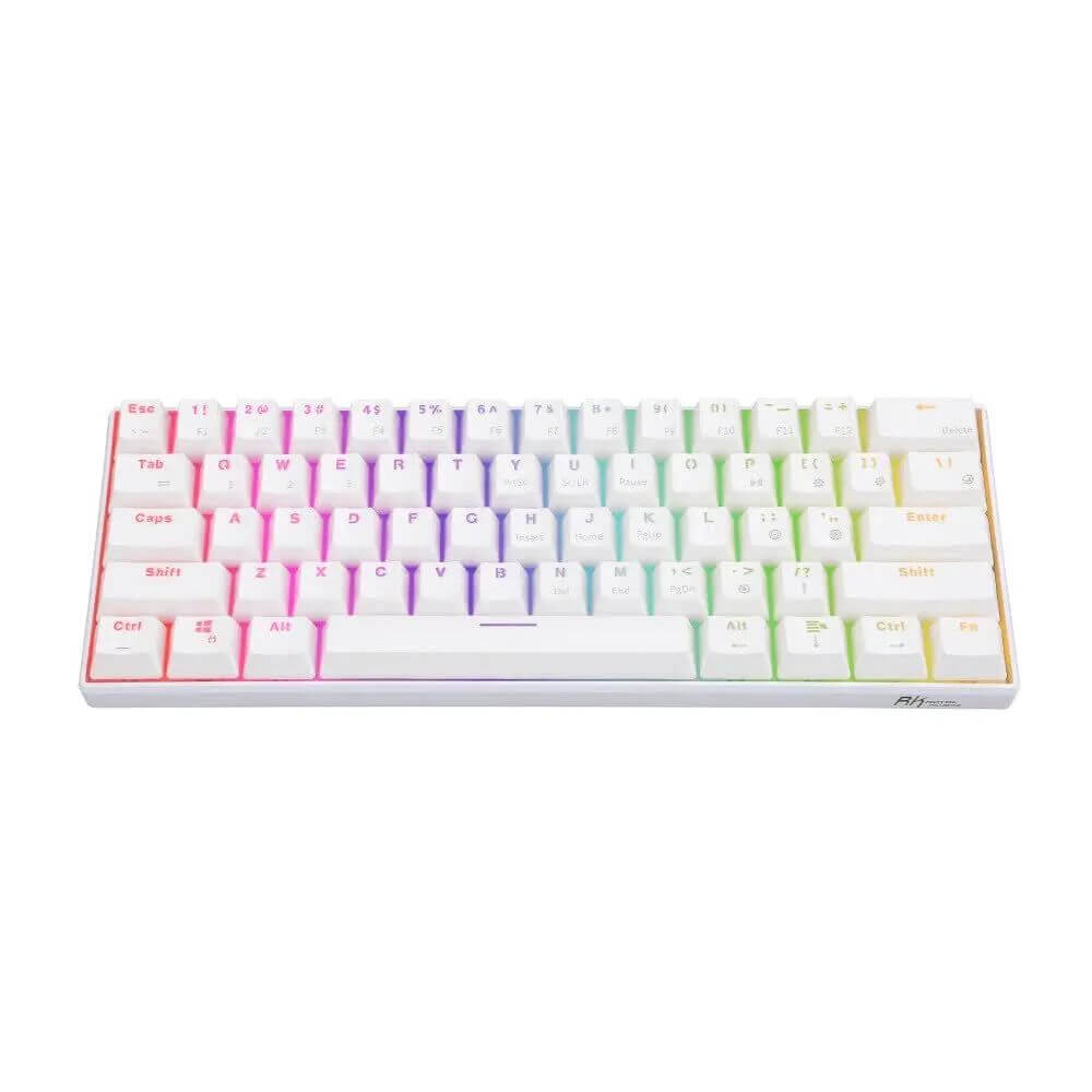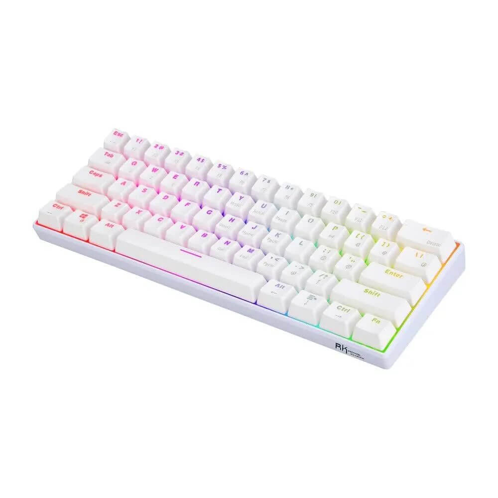 Беспроводная клавиатура Royal Kludge RK61 белая, Red Switch, русская раскладка с подсветкой 61 кнопки в нескольких режимах. Беспроводная клавиатура с подсветкой также поддерживает проводное соединение по USB. Совместима со всеми ОС для компьютера, в а беспроводном режиме с устройствами на базе Android, iOS. Клавиатура компьютера беспроводная может работать на протяжении 10 часов в режиме активного использования и до 360 в ожидании от литий-ионного аккумулятора. Полное восстановление заряда занимает 3 часа. Клавиатура белая беспроводная выполнена из прочного АБС пластика. Она устойчиво лежит на столе без скольжения во время использования.