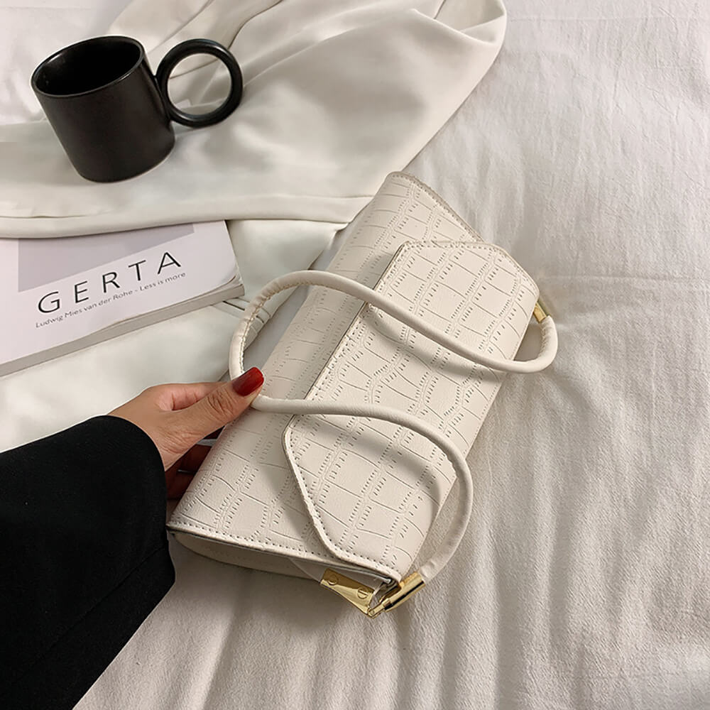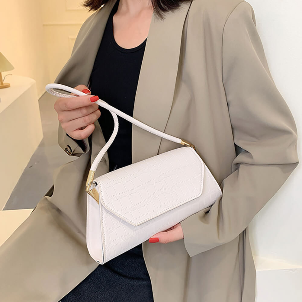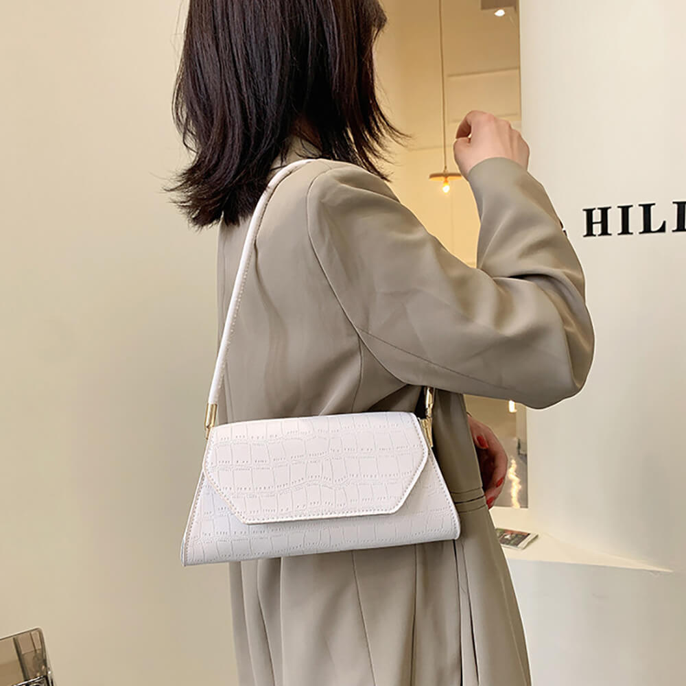Сумка-багет женская Stella белая в форме трапеции – идеальный вариант для выхода на праздничные мероприятия и ежедневной носки. Сумка женская выполнена из белой экологической кожи, которая не требует особого ухода. Мягкая экокожа хорошо переносит холод и жару, не трескается в минусовую температуру, не выцветает под действием ультрафиолета и не боится дождя или снега. Сумка через плечо имеет прочный каркас, поэтому не теряет своей формы. Клапан застегивается на магнитные замки. Длина ручек не регулируется. Прочная хлопковая подкладка не разрывается из-за острых предметов. Внутри сумки-багета есть объемный отсек и небольшой кармашек на молнии для мелочей.